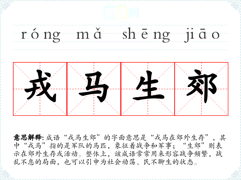 成语“戎马生郊”的字面意思是“戎马在郊外生存”,其中“戎马”指的是军队的马匹,象征着战争和军事;“生郊”则表示在郊外生存或活动。整体上,该成语常常用来形容战争频繁,战乱不息的局面,也可以引申为社会动荡、民不聊生的状态。