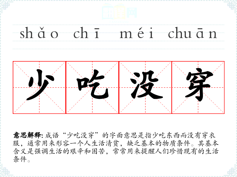 成语“少吃没穿”的字面意思是指少吃东西而没有穿衣服,通常用来形容一个人生活清贫,缺乏基本的物质条件。其基本含义是强调生活的艰辛和困苦,常常用来提醒人们珍惜现有的生活条件。