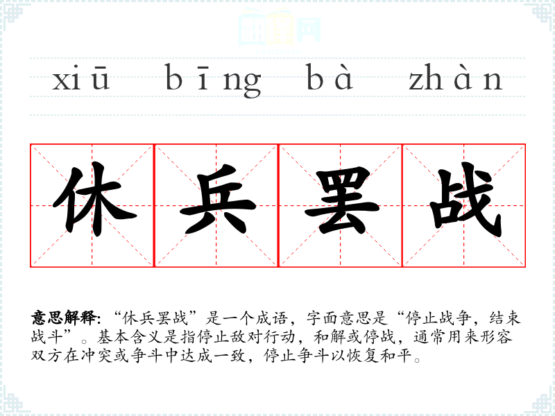 “休兵罢战”是一个成语,字面意思是“停止战争,结束战斗”。基本含义是指停止敌对行动,和解或停战,通常用来形容双方在冲突或争斗中达成一致,停止争斗以恢复和平。