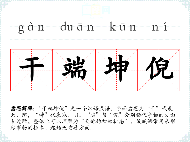 “干端坤倪”是一个汉语成语,字面意思为“干”代表天、阳,“坤”代表地、阴;“端”与“倪”分别指代事物的方面和边际。整体上可以理解为“天地的初始状态”。该成语常用来形容事物的根本、起始或重要方面。