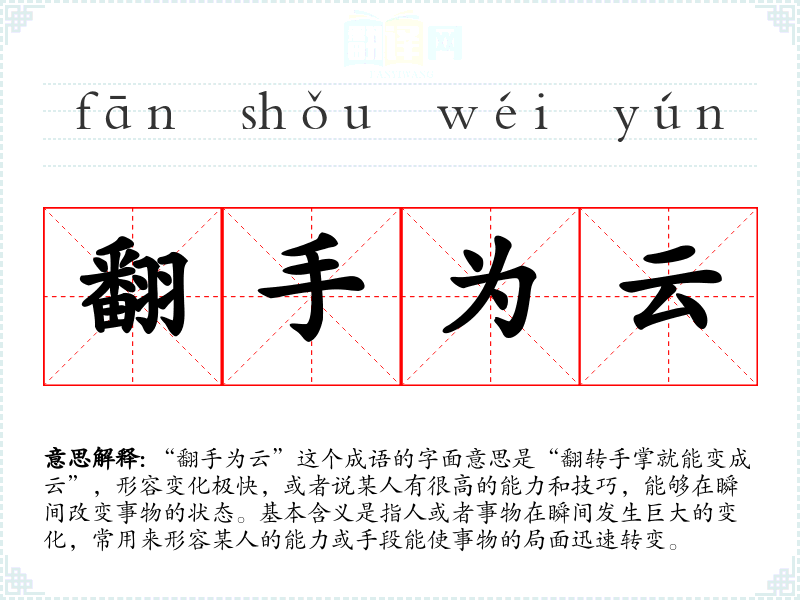 “翻手为云”出自唐代诗人李白的《春夜宴桃李园序》中的“翻手为云覆手为雨”,用以形容人的变化无常和能力之大。这一成语体现了古代文人对自然现象的感知与理解,强调了变化的迅速和不可预测性。