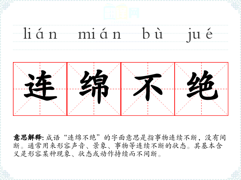 成语“连绵不绝”的字面意思是指事物连续不断,没有间断。通常用来形容声音、景象、事物等连续不断的状态。其基本含义是形容某种现象、状态或动作持续而不间断。