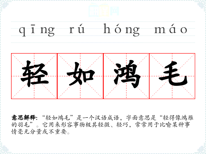 “轻如鸿毛”是一个汉语成语,字面意思是“轻得像鸿雁的羽毛”。它用来形容事物极其轻微、轻巧,常常用于比喻某种事情毫无分量或不重要。