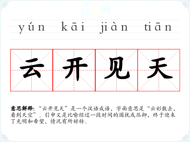“云开见天”是一个汉语成语,字面意思是“云彩散去,看到天空”。引申义是比喻经过一段时间的困扰或压抑,终于迎来了光明和希望,情况有所好转。