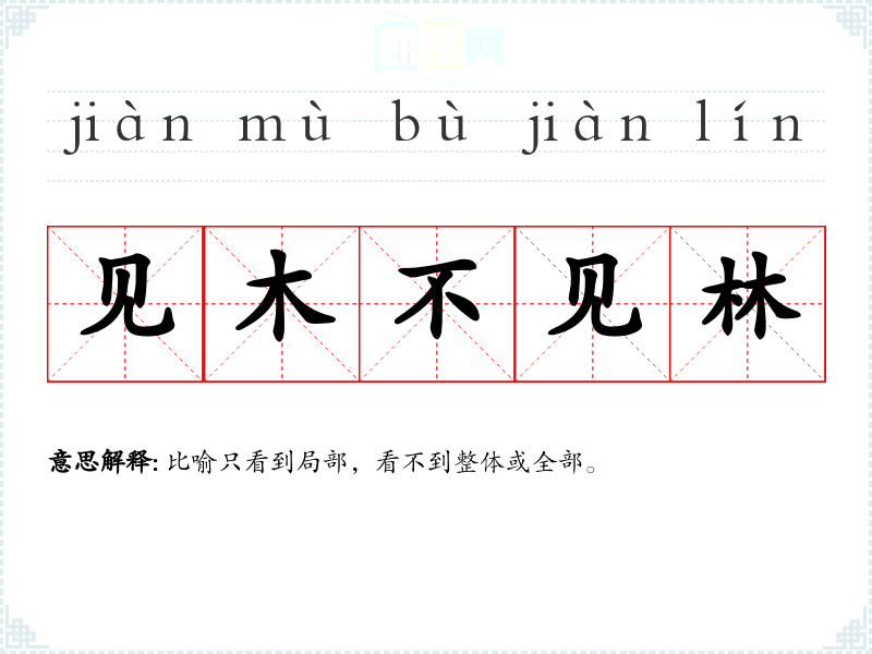 | 只见树木,不见森林 | 比喻只看到局部,看不到整体或全部。 |