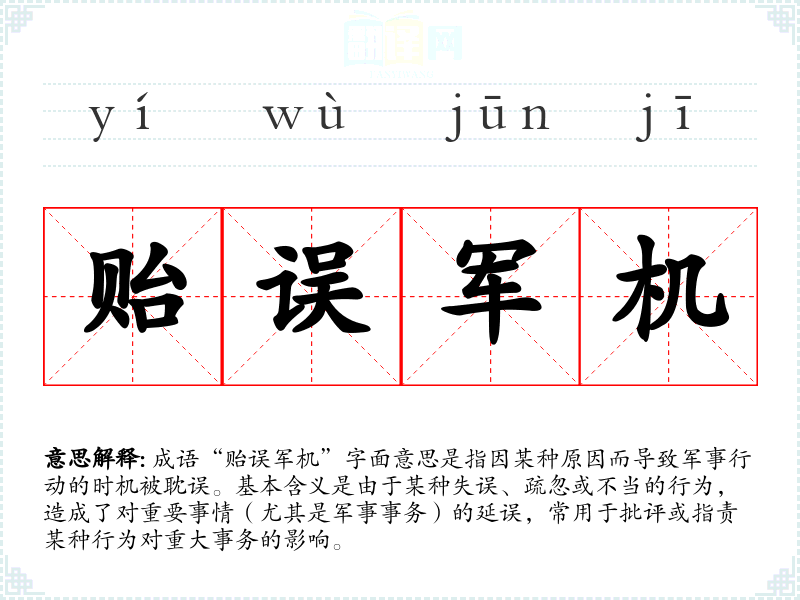 成语“贻误军机”字面意思是指因某种原因而导致军事行动的时机被耽误。基本含义是由于某种失误、疏忽或不当的行为,造成了对重要事情(尤其是军事事务)的延误,常用于批评或指责某种行为对重大事务的影响。