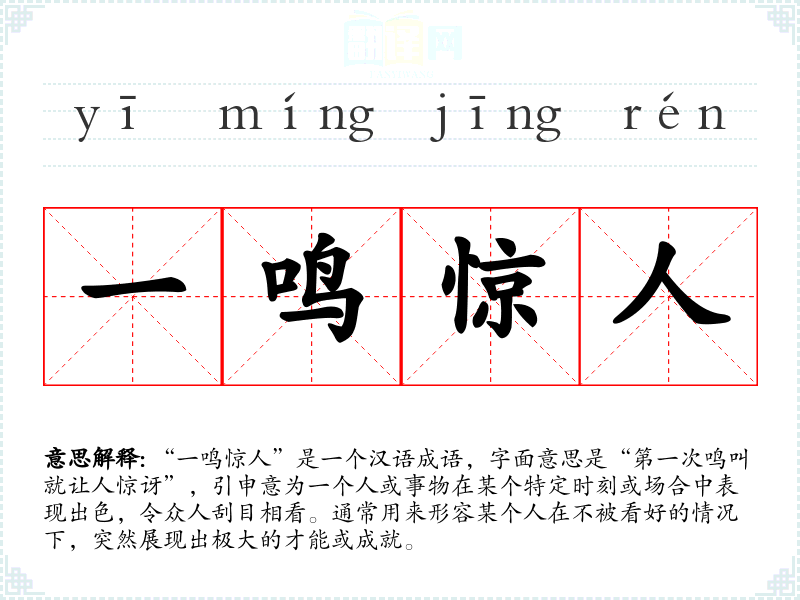 “一鸣惊人”是一个汉语成语,字面意思是“第一次鸣叫就让人惊讶”,引申意为一个人或事物在某个特定时刻或场合中表现出色,令众人刮目相看。通常用来形容某个人在不被看好的情况下,突然展现出极大的才能或成就。