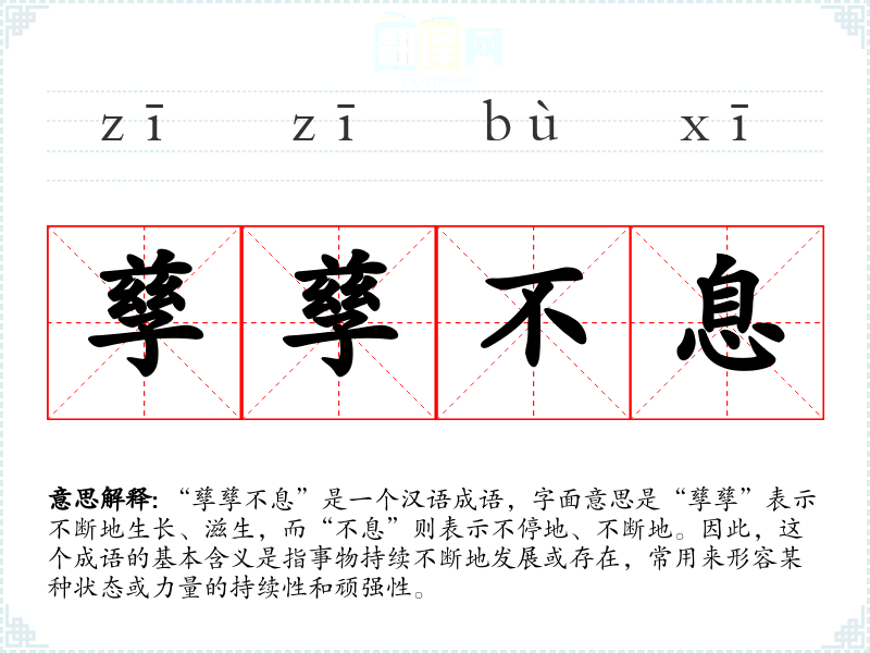 “孳孳不息”是一个汉语成语,字面意思是“孳孳”表示不断地生长、滋生,而“不息”则表示不停地、不断地。因此,这个成语的基本含义是指事物持续不断地发展或存在,常用来形容某种状态或力量的持续性和顽强性。