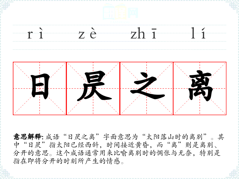 成语“日昃之离”字面意思为“太阳落山时的离别”。其中“日昃”指太阳已经西斜,时间接近黄昏,而“离”则是离别、分开的意思。这个成语通常用来比喻离别时的惆怅与无奈,特别是指在即将分开的时刻所产生的情感。