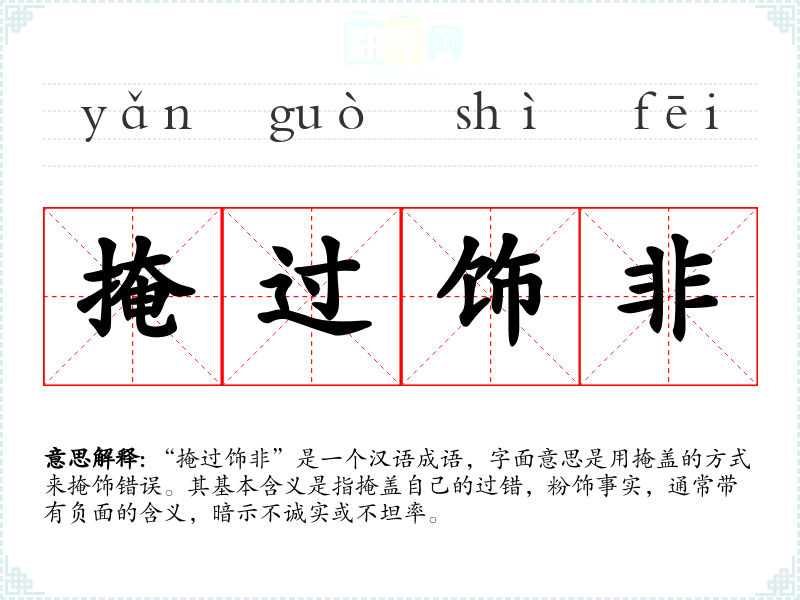 “掩过饰非”是一个汉语成语,字面意思是用掩盖的方式来掩饰错误。其基本含义是指掩盖自己的过错,粉饰事实,通常带有负面的含义,暗示不诚实或不坦率。