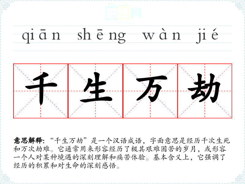 在英语中,类似于“千生万劫”的表达可能是“through thick and thin”,强调经历艰难困苦的过程。虽然表达形式不同,但传达的核心思想相似,都是关于经历与成长的故事。