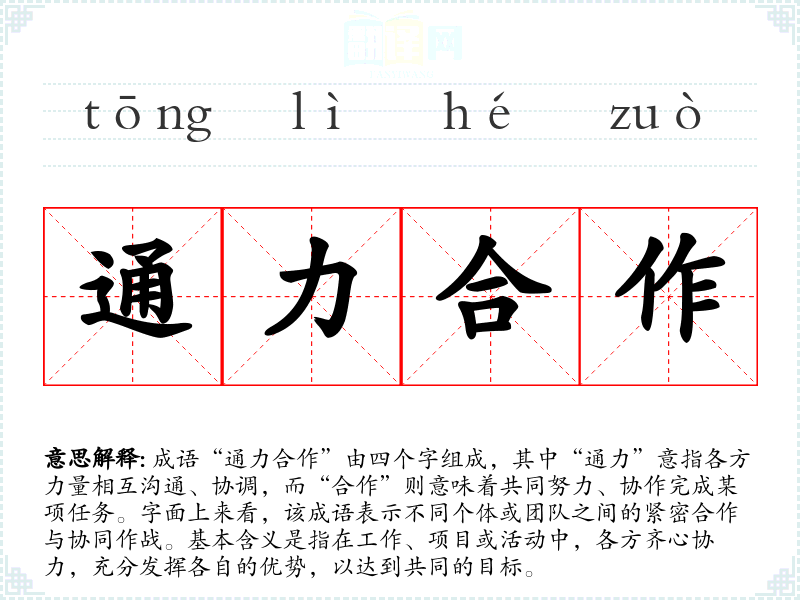 成语“通力合作”由四个字组成,其中“通力”意指各方力量相互沟通、协调,而“合作”则意味着共同努力、协作完成某项任务。字面上来看,该成语表示不同个体或团队之间的紧密合作与协同作战。基本含义是指在工作、项目或活动中,各方齐心协力,充分发挥各自的优势,以达到共同的目标。