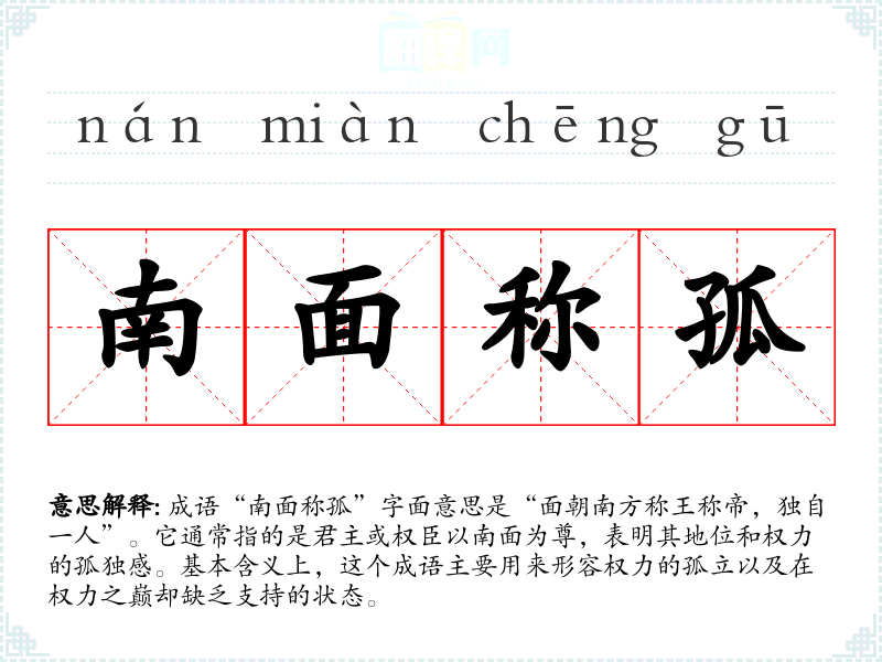 成语“南面称孤”字面意思是“面朝南方称王称帝,独自一人”。它通常指的是君主或权臣以南面为尊,表明其地位和权力的孤独感。基本含义上,这个成语主要用来形容权力的孤立以及在权力之巅却缺乏支持的状态。
