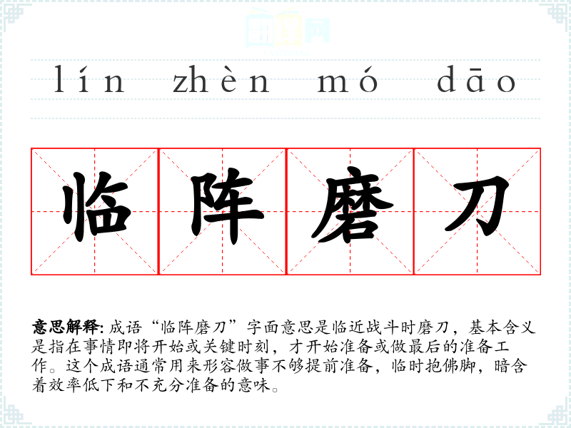 成语“临阵磨刀”字面意思是临近战斗时磨刀,基本含义是指在事情即将开始或关键时刻,才开始准备或做最后的准备工作。这个成语通常用来形容做事不够提前准备,临时抱佛脚,暗含着效率低下和不充分准备的意味。
