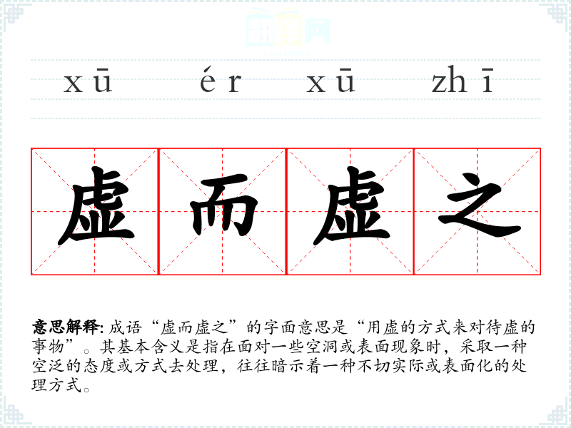 成语“虚而虚之”的字面意思是“用虚的方式来对待虚的事物”。其基本含义是指在面对一些空洞或表面现象时,采取一种空泛的态度或方式去处理,往往暗示着一种不切实际或表面化的处理方式。