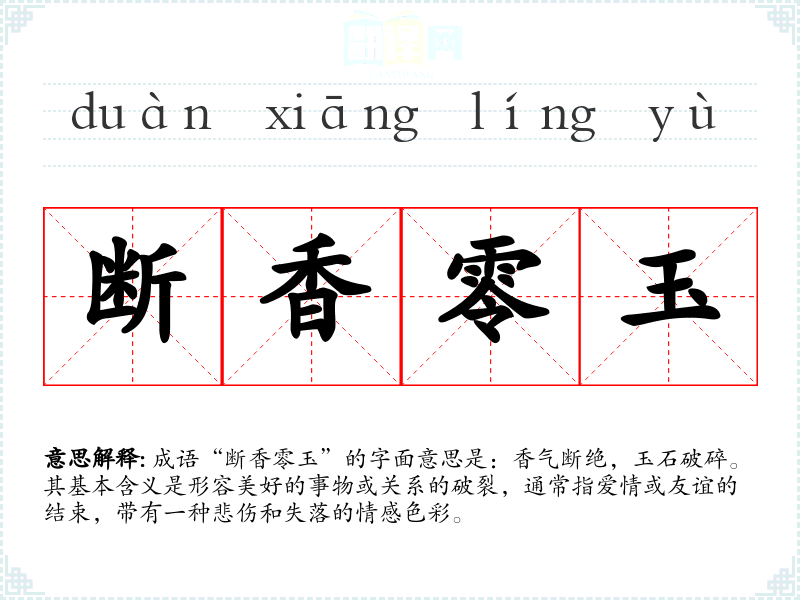 成语“断香零玉”的字面意思是:香气断绝,玉石破碎。其基本含义是形容美好的事物或关系的破裂,通常指爱情或友谊的结束,带有一种悲伤和失落的情感色彩。