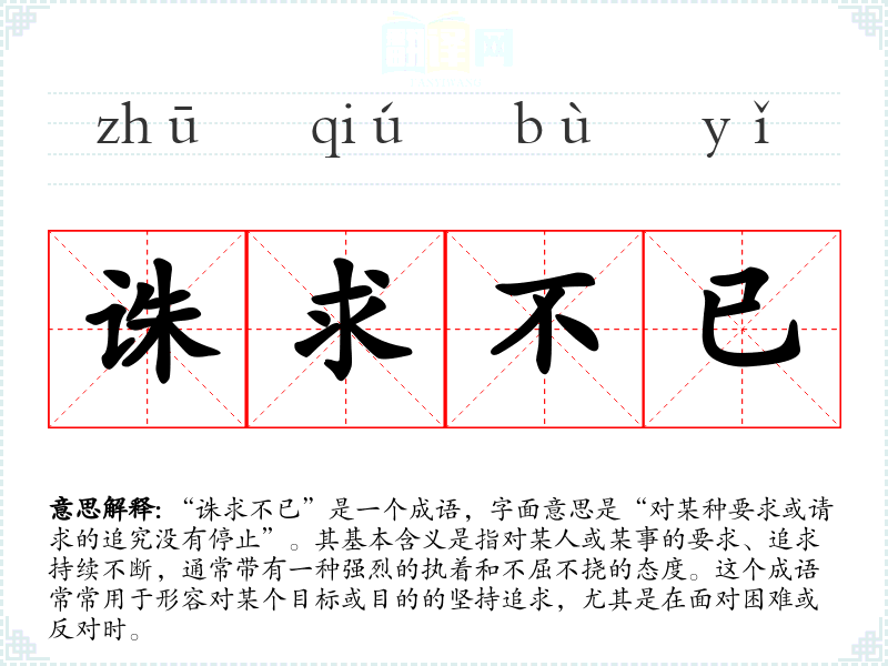 “诛求不已”是一个成语,字面意思是“对某种要求或请求的追究没有停止”。其基本含义是指对某人或某事的要求、追求持续不断,通常带有一种强烈的执着和不屈不挠的态度。这个成语常常用于形容对某个目标或目的的坚持追求,尤其是在面对困难或反对时。