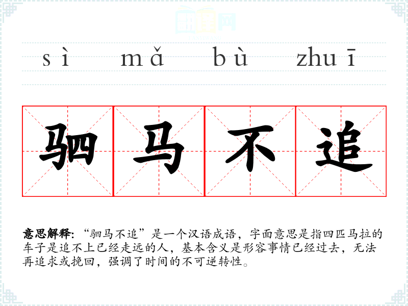 “驷马不追”是一个汉语成语,字面意思是指四匹马拉的车子是追不上已经走远的人,基本含义是形容事情已经过去,无法再追求或挽回,强调了时间的不可逆转性。