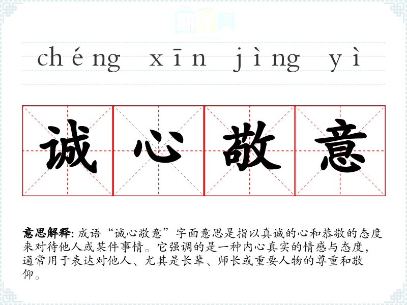 成语“诚心敬意”字面意思是指以真诚的心和恭敬的态度来对待他人或某件事情。它强调的是一种内心真实的情感与态度,通常用于表达对他人、尤其是长辈、师长或重要人物的尊重和敬仰。
