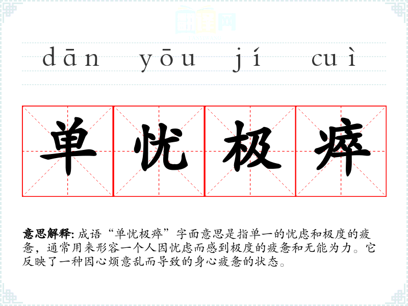 成语“单忧极瘁”字面意思是指单一的忧虑和极度的疲惫,通常用来形容一个人因忧虑而感到极度的疲惫和无能为力。它反映了一种因心烦意乱而导致的身心疲惫的状态。