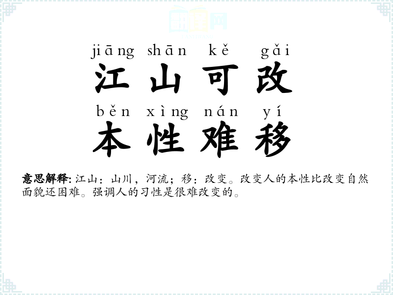 江山:山川,河流;移:改变。改变人的本性比改变自然面貌还困难。强调人的习性是很难改变的。 |