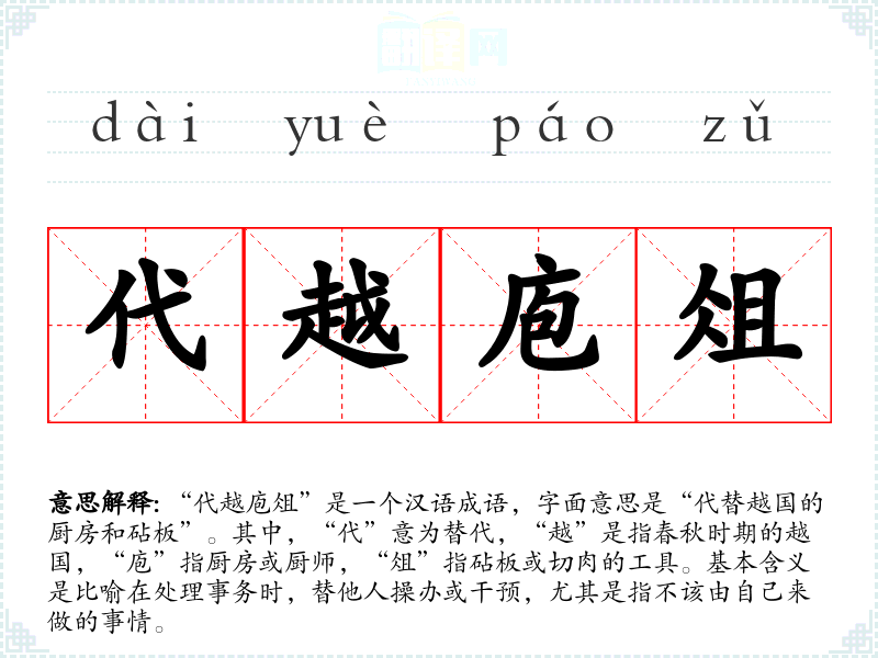 “代越庖俎”是一个汉语成语,字面意思是“代替越国的厨房和砧板”。其中,“代”意为替代,“越”是指春秋时期的越国,“庖”指厨房或厨师,“俎”指砧板或切肉的工具。基本含义是比喻在处理事务时,替他人操办或干预,尤其是指不该由自己来做的事情。