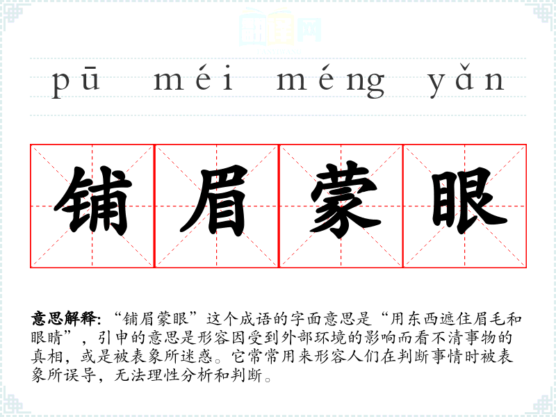 “铺眉蒙眼”这个成语的字面意思是“用东西遮住眉毛和眼睛”,引申的意思是形容因受到外部环境的影响而看不清事物的真相,或是被表象所迷惑。它常常用来形容人们在判断事情时被表象所误导,无法理性分析和判断。