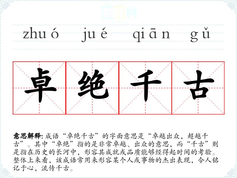 成语“卓绝千古”的字面意思是“卓越出众,超越千古”。其中“卓绝”指的是非常卓越、出众的意思,而“千古”则是指在历史的长河中,形容其成就或品质能够经得起时间的考验。整体上来看,该成语常用来形容某个人或事物的杰出表现,令人铭记于心,流传千古。