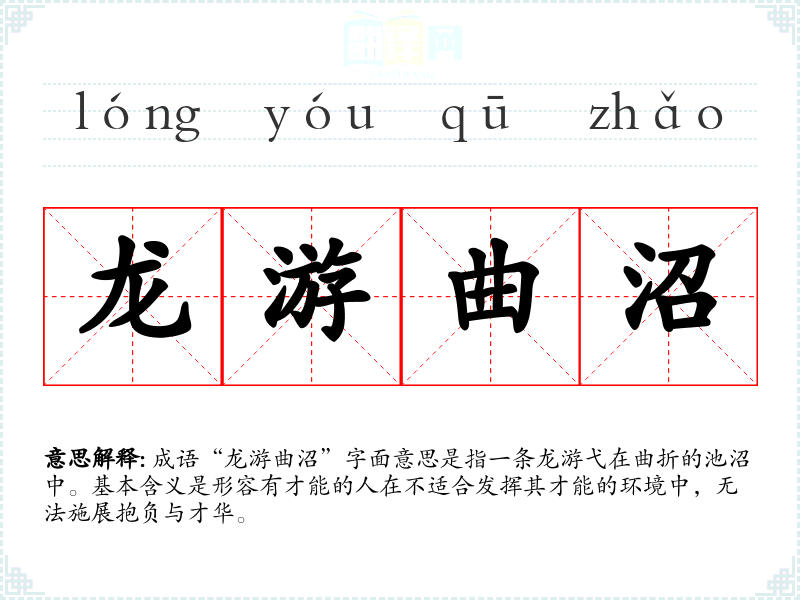 成语“龙游曲沼”字面意思是指一条龙游弋在曲折的池沼中。基本含义是形容有才能的人在不适合发挥其才能的环境中,无法施展抱负与才华。