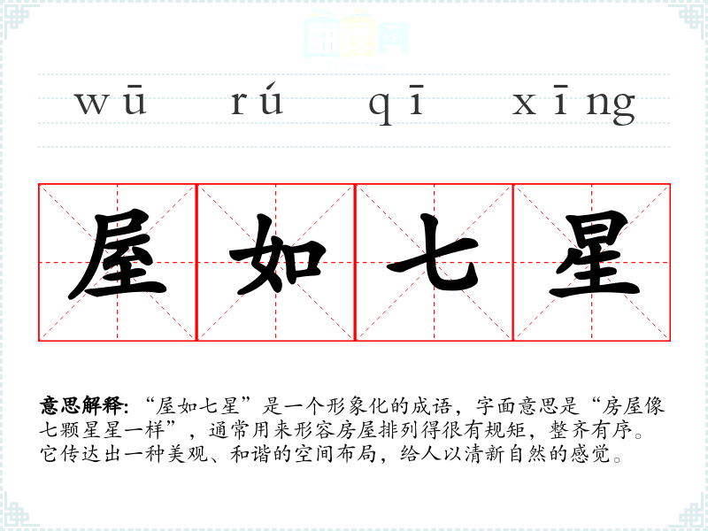 “屋如七星”是一个形象化的成语,字面意思是“房屋像七颗星星一样”,通常用来形容房屋排列得很有规矩,整齐有序。它传达出一种美观、和谐的空间布局,给人以清新自然的感觉。