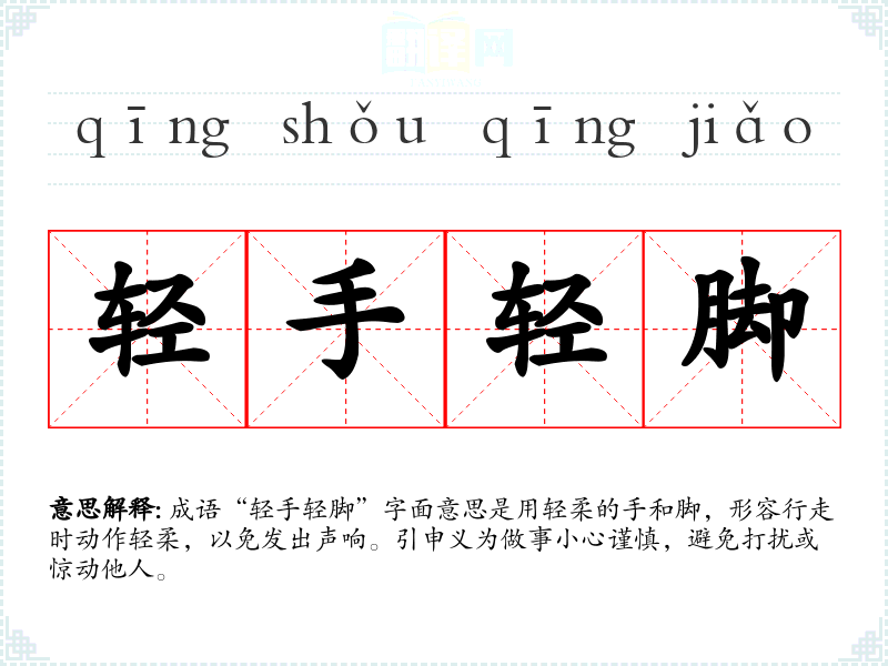 成语“轻手轻脚”字面意思是用轻柔的手和脚,形容行走时动作轻柔,以免发出声响。引申义为做事小心谨慎,避免打扰或惊动他人。