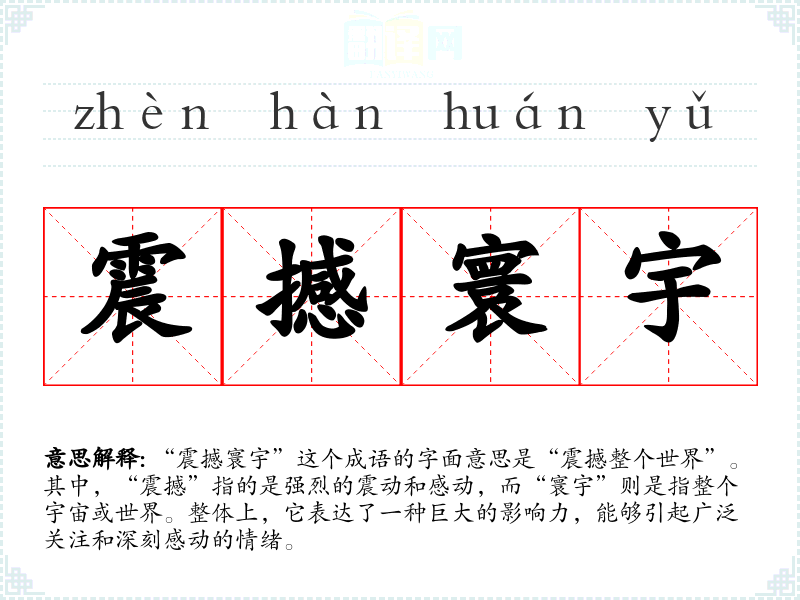 “震撼寰宇”这个成语的字面意思是“震撼整个世界”。其中,“震撼”指的是强烈的震动和感动,而“寰宇”则是指整个宇宙或世界。整体上,它表达了一种巨大的影响力,能够引起广泛关注和深刻感动的情绪。