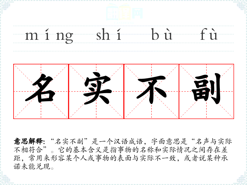 “名实不副”是一个汉语成语,字面意思是“名声与实际不相符合”。它的基本含义是指事物的名称和实际情况之间存在差距,常用来形容某个人或事物的表面与实际不一致,或者说某种承诺未能兑现。