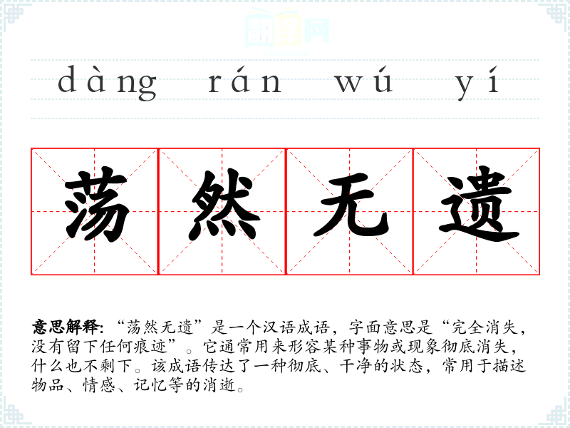 - 日常对话:在聊天中描述遗失的物品或消失的记忆,例如“他昨天的烦恼经过一夜的睡眠后荡然无遗”。