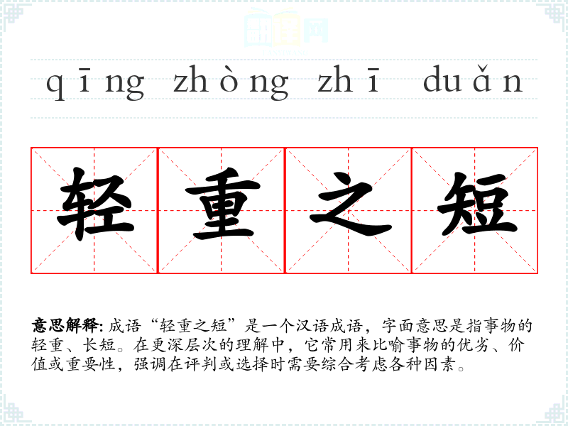 成语“轻重之短”是一个汉语成语,字面意思是指事物的轻重、长短。在更深层次的理解中,它常用来比喻事物的优劣、价值或重要性,强调在评判或选择时需要综合考虑各种因素。