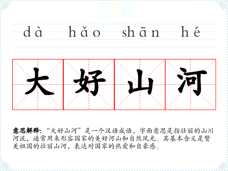 - 日常对话:可以用于表达对祖国的热爱,如“我们要保护好这片大好山河”。