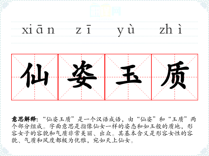“仙姿玉质”最早见于唐代诗人李白的作品。在古代文学中,仙女常常被描绘为美丽而超凡脱俗的存在,而“玉”则象征着纯洁和珍贵。该成语的形成与古代对美的追求和歌颂密切相关,反映了古代文人对女性美的理想化表达。
