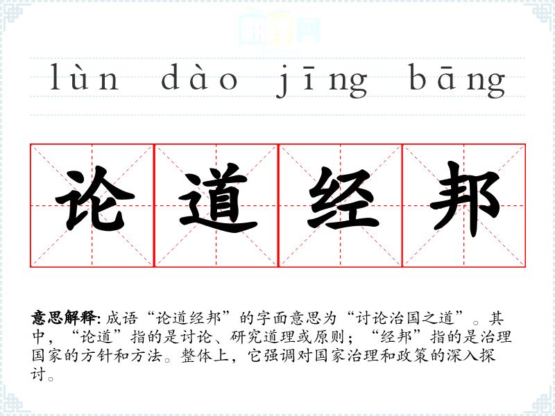 成语“论道经邦”的字面意思为“讨论治国之道”。其中,“论道”指的是讨论、研究道理或原则;“经邦”指的是治理国家的方针和方法。整体上,它强调对国家治理和政策的深入探讨。