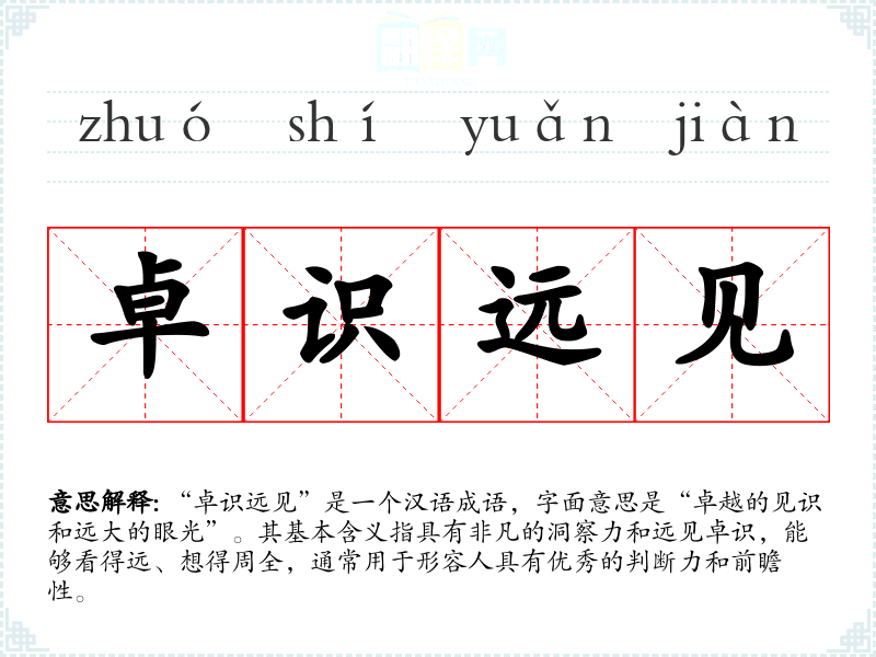 “卓识远见”是一个汉语成语,字面意思是“卓越的见识和远大的眼光”。其基本含义指具有非凡的洞察力和远见卓识,能够看得远、想得周全,通常用于形容人具有优秀的判断力和前瞻性。