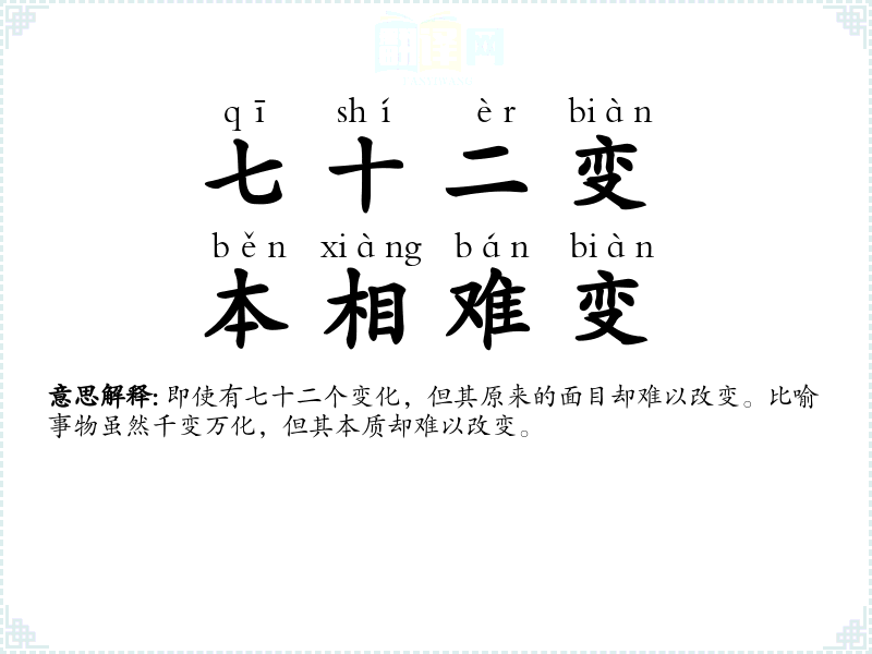即使有七十二个变化,但其原来的面目却难以改变。比喻事物虽然千变万化,但其本质却难以改变。 |