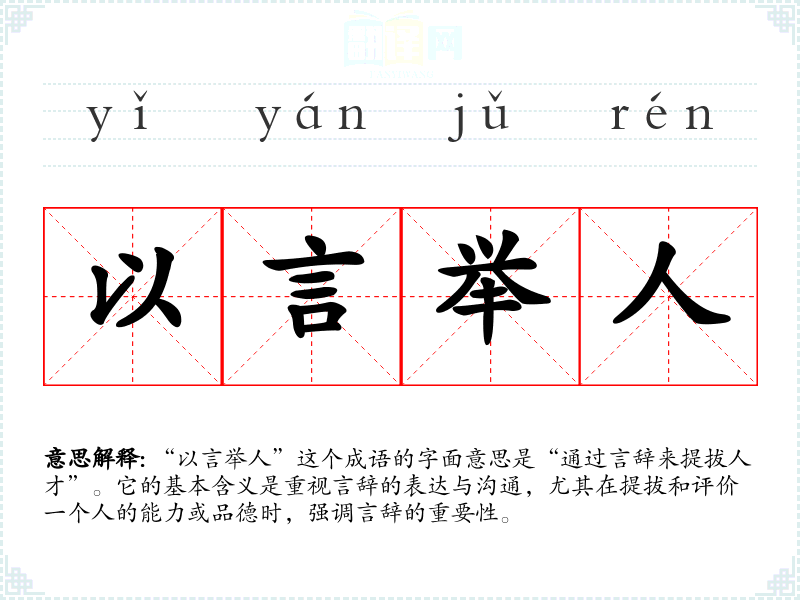 “以言举人”这个成语的字面意思是“通过言辞来提拔人才”。它的基本含义是重视言辞的表达与沟通,尤其在提拔和评价一个人的能力或品德时,强调言辞的重要性。