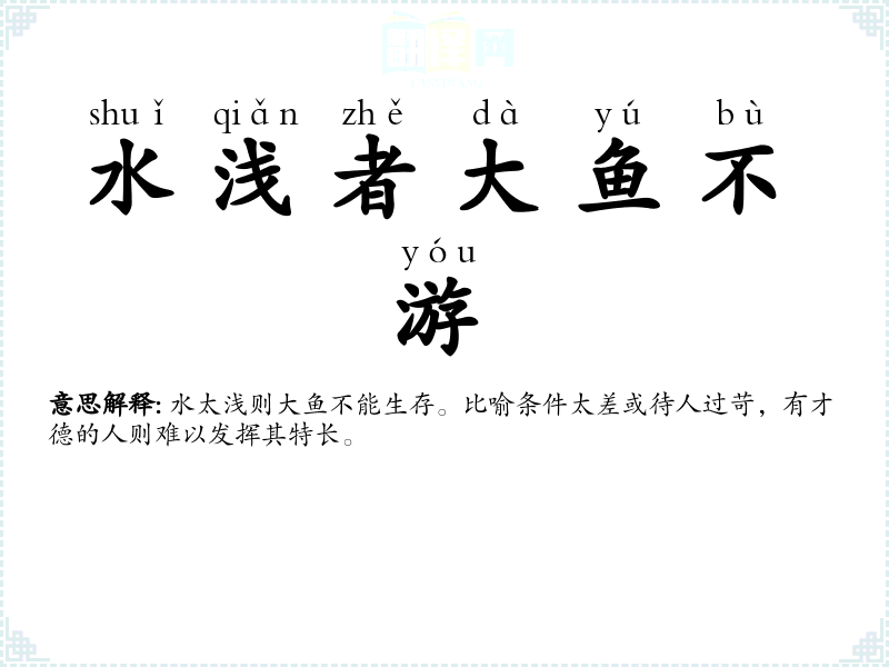 水太浅则大鱼不能生存。比喻条件太差或待人过苛,有才德的人则难以发挥其特长。