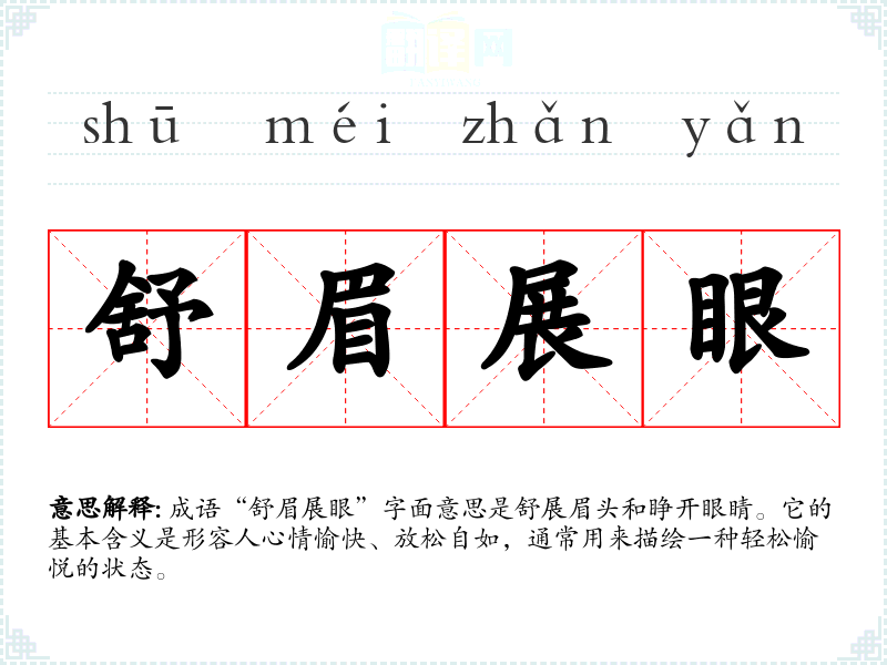 成语“舒眉展眼”字面意思是舒展眉头和睁开眼睛。它的基本含义是形容人心情愉快、放松自如,通常用来描绘一种轻松愉悦的状态。