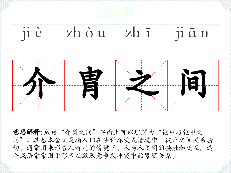 成语“介胄之间”字面上可以理解为“铠甲与铠甲之间”。其基本含义是指人们在某种环境或情境中,彼此之间关系密切,通常用来形容在特定的情境下,人与人之间的接触和交互。这个成语常常用于形容在激烈竞争或冲突中的紧密关系。