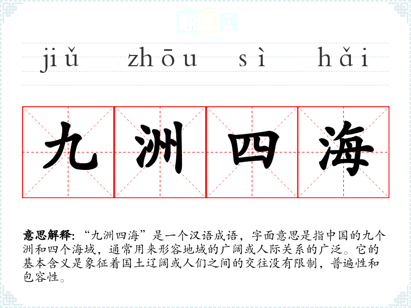 “九洲四海”是一个汉语成语,字面意思是指**的九个洲和四个海域,通常用来形容地域的广阔或人际关系的广泛。它的基本含义是象征着国土辽阔或人们之间的交往没有限制,普遍性和包容性。