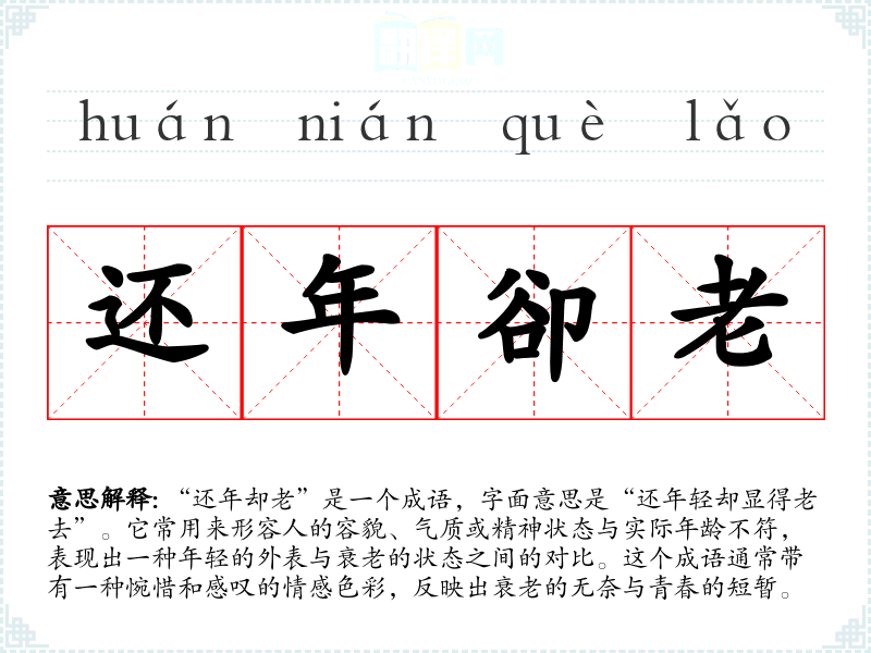 “还年却老”是一个成语,字面意思是“还年轻却显得老去”。它常用来形容人的容貌、气质或精神状态与实际年龄不符,表现出一种年轻的外表与衰老的状态之间的对比。这个成语通常带有一种惋惜和感叹的情感色彩,反映出衰老的无奈与青春的短暂。