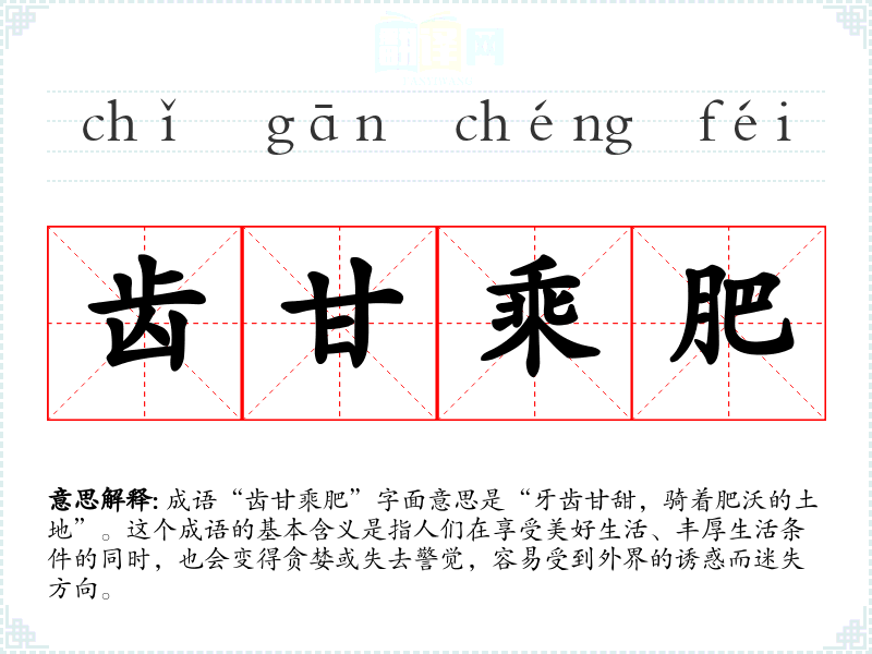 成语“齿甘乘肥”字面意思是“牙齿甘甜,骑着肥沃的土地”。这个成语的基本含义是指人们在享受美好生活、丰厚生活条件的同时,也会变得贪婪或失去警觉,容易受到外界的诱惑而迷失方向。