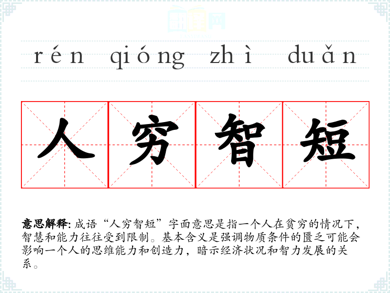 “人穷智短”出自古代的典籍,虽然没有具体的出处,但在古代文献中类似的论述常常出现。它反映了古人对财富、地位与智慧关系的思考,表明贫穷不仅影响生活条件,也可能影响人的思维深度和创新能力。