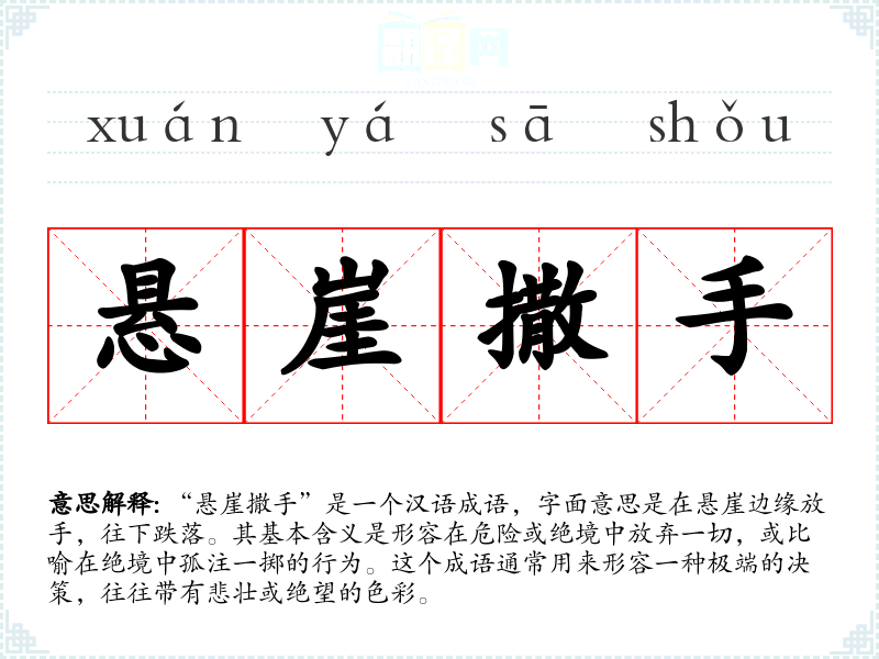“悬崖撒手”是一个汉语成语,字面意思是在悬崖边缘放手,往下跌落。其基本含义是形容在危险或绝境中放弃一切,或比喻在绝境中孤注一掷的行为。这个成语通常用来形容一种极端的决策,往往带有悲壮或绝望的色彩。
