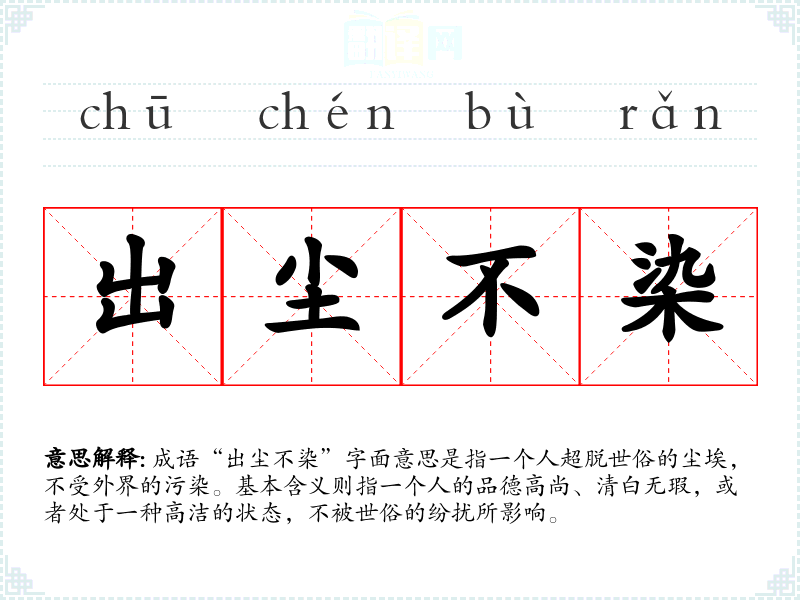 成语“出尘不染”字面意思是指一个人超脱世俗的尘埃,不受外界的污染。基本含义则指一个人的品德高尚、清白无瑕,或者处于一种高洁的状态,不被世俗的纷扰所影响。
